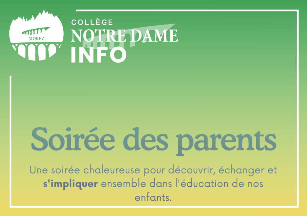 Le mardi 3 février, de 18h à 20h, le groupe scolaire Notre-Dame a le plaisir d’organiser une Soirée des parents